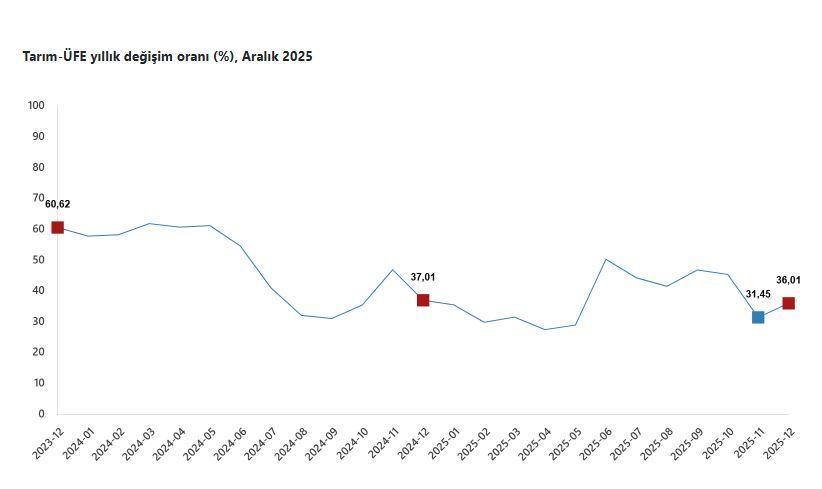 TÜİK, Aralık 2025 dönemine ilişkin tarım ürünleri üretici fiyat endeksi verilerini açıkladı. Buna göre; tarım ürünleri üretici fiyatları aralık ayında bir önceki aya göre yüzde 3,06, bir önceki yılın aynı ayına göre yüzde 36,01 ve 12 aylık ortalamalara göre yüzde 37,47 arttı.