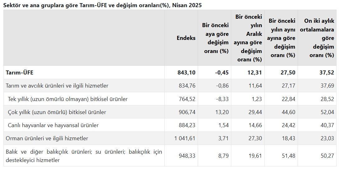 TÜİK, Nisan 2025 dönemine ilişkin tarım ürünleri üretici fiyat endeksi verilerini açıkladı. Buna göre; tarım ürünleri üretici fiyatları, bir önceki aya göre yüzde 0,45 azaldı, bir önceki yılın aralık ayına göre yüzde 12,31, bir önceki yılın aynı ayına göre yüzde 27,50 ve 12 aylık ortalamalara göre yüzde 37,52 arttı.