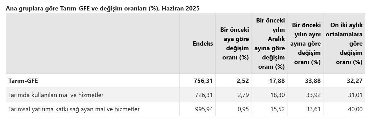 TÜİK, Haziran 2025 dönemine ilişkin tarımsal girdi fiyat endeksi verilerini açıkladı. Buna göre; tarımsal girdi fiyatları, 2025 yılı Haziran ayında bir önceki aya göre yüzde 2,52, bir önceki yılın aralık ayına göre yüzde 17,88, bir önceki yılın aynı ayına göre yüzde 33,88 ve 12 aylık ortalamalara göre yüzde 32,27 arttı.