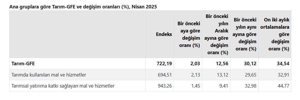 TÜİK, Nisan 2025 dönemine ilişkin tarımsal girdi fiyat endeksi verilerini açıkladı. Buna göre; tarımsal girdi fiyatları bir önceki aya göre yüzde 2,03, bir önceki yılın aralık ayına göre yüzde 12,56, bir önceki yılın aynı ayına göre yüzde 30,12 ve 12 aylık ortalamalara göre yüzde 34,54 arttı. Ana gruplarda bir önceki aya göre, tarımda kullanılan mal ve hizmetler endeksinde yüzde 2,13 artış, tarımsal yatırıma katkı sağlayan mal ve hizmetler endeksinde yüzde 1,45 artış gerçekleşti. Bir önceki yılın aynı ayına göre tarımda kullanılan mal ve hizmetler endeksinde yüzde 29,65 artış, tarımsal yatırıma katkı sağlayan mal ve hizmetler endeksinde yüzde 32,98 artış gerçekleşti. Yıllık değişimin en yüksek olduğu alt grup yüzde 56,94 artış ile veteriner harcamaları, aylık değişimin en yüksek olduğu alt grup yüzde 3,61 artış ile hayvan yemi oldu. (DHA)