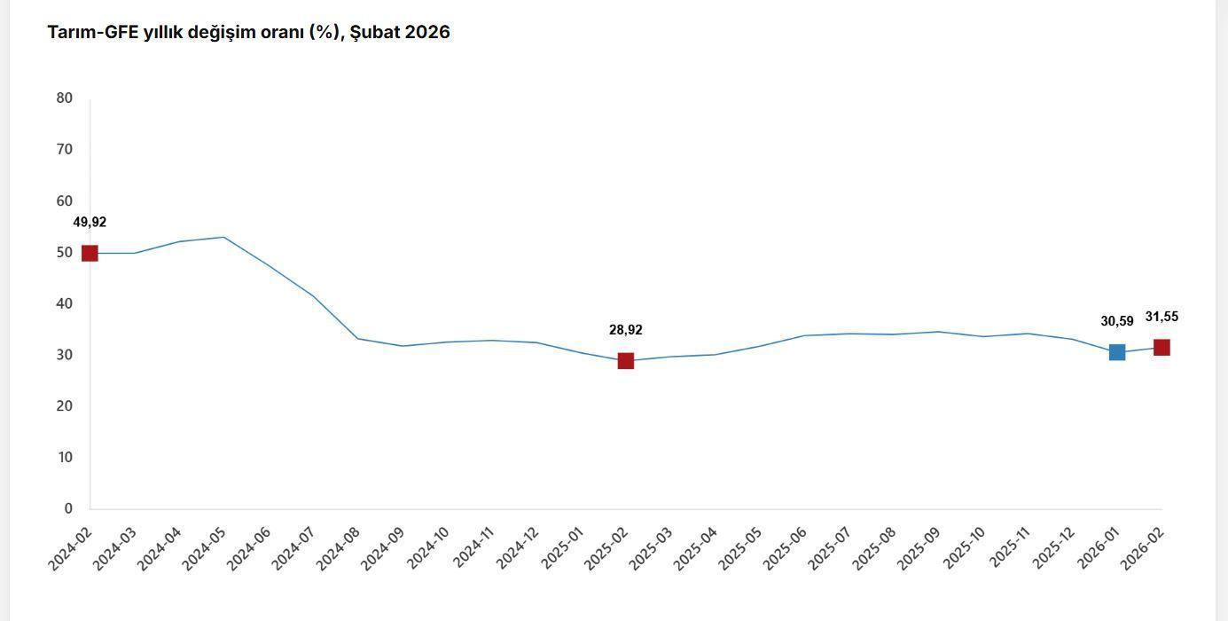 TÜİK, Şubat 2026 dönemine ilişkin tarımsal girdi fiyat endeksi verilerini açıkladı. Buna göre; tarımsal girdi fiyatları 2026 yılı Şubat ayında bir önceki aya göre yüzde 3,10, bir önceki yılın aralık ayına göre yüzde 7,08, bir önceki yılın aynı ayına göre yüzde 31,55 ve 12 aylık ortalamalara göre yüzde 32,64 arttı. Ana gruplarda bir önceki aya göre, tarımda kullanılan mal ve hizmetler endeksinde yüzde 2,96 artış, tarımsal yatırıma katkı sağlayan mal ve hizmetler endeksinde yüzde 3,94 artış gerçekleşti. Bir önceki yılın aynı ayına göre tarımda kullanılan mal ve hizmetler endeksinde yüzde 32,81 artış, tarımsal yatırıma katkı sağlayan mal ve hizmetler endeksinde yüzde 24,31 artış gerçekleşti. Yıllık değişimin en yüksek olduğu alt grup yüzde 41,37 artış ile veteriner harcamaları, aylık değişimin en yüksek olduğu alt grup yüzde 4,31 artış ile malzemeler oldu. (DHA)