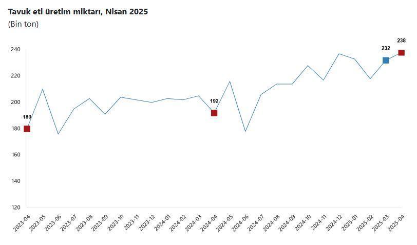 ANKARA, (DHA)- TÜRKİYE İstatistik Kurumu (TÜİK), nisanda aylık tavuk eti üretiminin arttığını, yumurta ve içme sütü üretiminin azaldığını açıkladı.