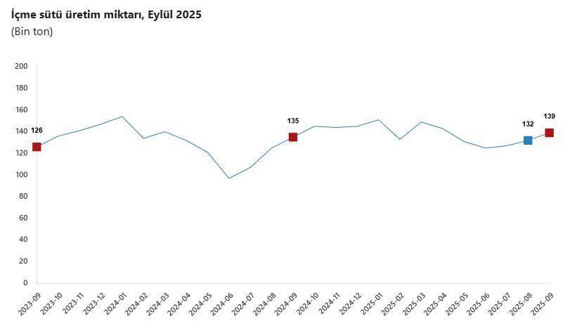 Bir önceki ay 933 bin 234 ton olan ticari süt işletmelerince toplanan inek sütü miktarı eylül ayında yüzde 4,3 oranında azalarak 892 bin 886 ton oldu. Bir önceki ay 132 bin 359 ton olan içme sütü üretimi eylül ayında yüzde 4,8 oranında artarak 138 bin 726 ton olarak gerçekleşti. Ticari süt işletmeleri tarafından toplanan inek sütü miktarı, eylül ayında bir önceki yılın aynı ayına göre yüzde 1,7 azaldı, ocak-eylül döneminde bir önceki yılın aynı dönemine göre yüzde 0,3 arttı.