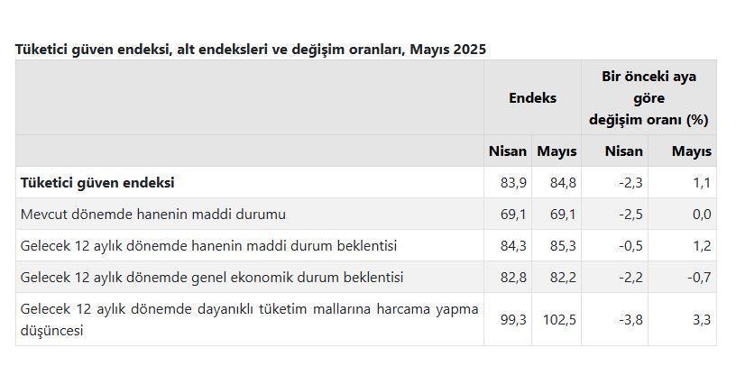 ANKARA, (DHA)- TÜRKİYE İstatistik Kurumu (TÜİK), tüketici güven endeksinin mayısta aylık 1,1 artarak 84,8 olduğunu açıkladı.