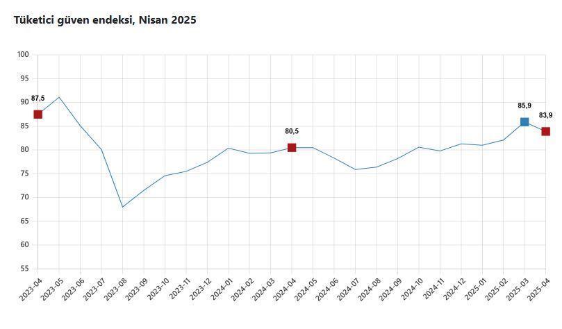 ANKARA, (DHA)- TÜRKİYE İstatistik Kurumu (TÜİK), tüketici güven endeksinin nisanda bir önceki aya göre yüzde 2,3 oranında azalarak 83,9 olduğunu açıkladı.