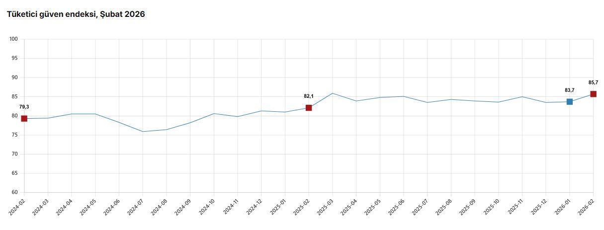 TÜİK, Şubat 2026 dönemine ilişkin tüketici güven endeksi verilerini açıkladı. Buna göre; tüketici güven endeksi, şubat ayında bir önceki aya göre yüzde 2,3 oranında artarak 85,7 oldu. Alt endekslerine bakıldığında; bir önceki aya göre mevcut dönemde hanenin maddi durumu endeksi 4,6 artarak 71,3, gelecek 12 aylık dönemde hanenin maddi durum beklentisi endeksi 4,2 artarak 86,8, gelecek 12 aylık dönemde genel ekonomik durum beklentisi endeksi 0,1 azalarak 81,4 ve gelecek 12 aylık dönemde dayanıklı tüketim mallarına harcama yapma düşüncesi endeksi 1,3 artarak 103,2 değerlerini aldı. (DHA)