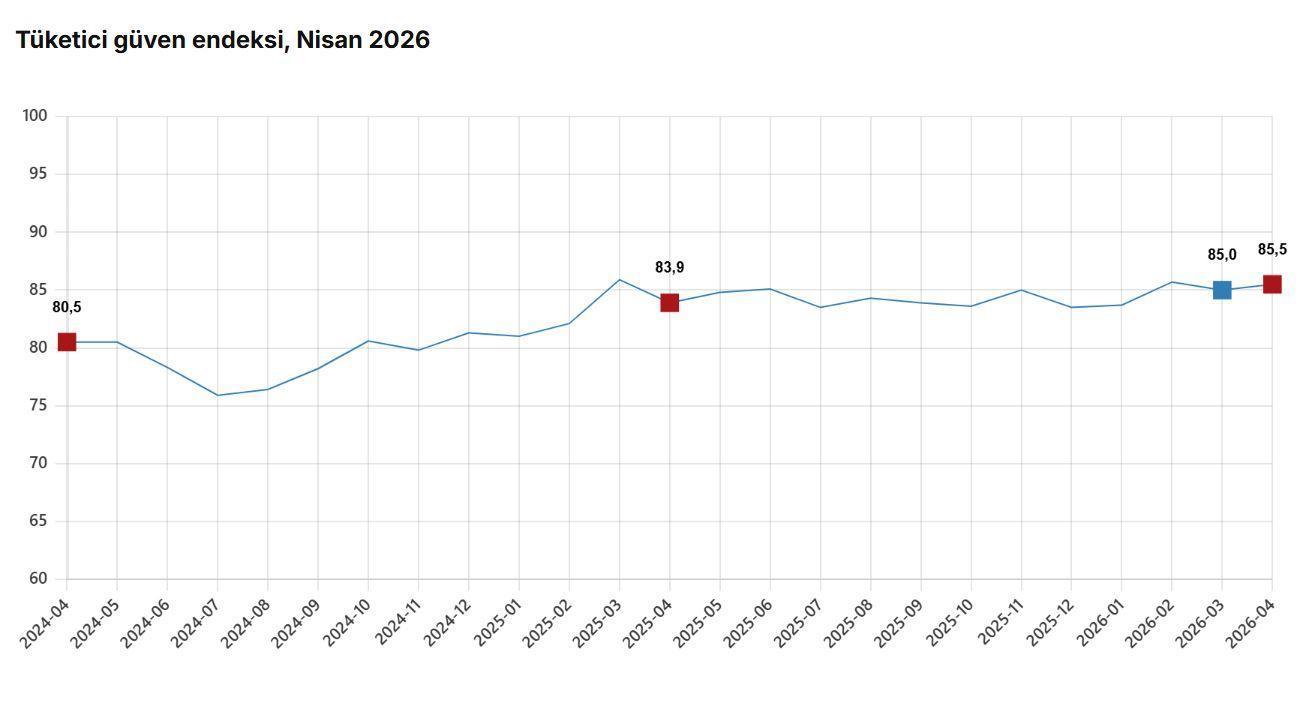 ANKARA, (DHA)- TÜRKİYE İstatistik Kurumu (TÜİK), nisan ayında tüketici güven endeksinin yüzde 0,5 oranında artarak, 85,5 olduğunu açıkladı.