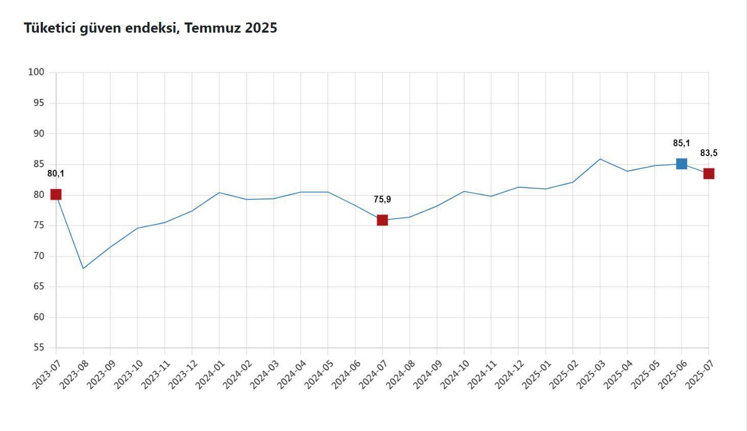 ANKARA, (DHA)- TÜRKİYE İstatistik Kurumu (TÜİK), temmuz ayında tüketici güven endeksinin bir önceki aya göre yüzde 1,8 oranında azalarak 83,5 olduğunu açıkladı.