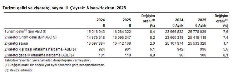 Ülkeden çıkış yapan ziyaretçi sayısı 2025 yılı 2'nci çeyreğinde bir önceki yılın aynı çeyreğine göre yüzde 2 artarak 16 milyon 412 bin 168 kişi oldu. Ziyaretçilerin yüzde 16,3'ünü 2 milyon 678 bin 105 kişi ile yurt dışında ikamet eden vatandaşlar oluşturdu. Ziyaretçilerin gecelik ortalama harcaması 110 dolar oldu. Yurt dışında ikamet eden vatandaşların gecelik ortalama harcaması ise 73 dolar oldu.