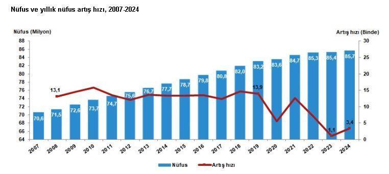 Caner ÜNVER/ANKARA, (DHA)- TÜRKİYE İstatistik Kurumu (TÜİK), Türkiye'de ikamet eden nüfusun, 31 Aralık 2024 tarihi itibarıyla bir önceki yıla göre 292 bin 567 kişi artarak 85 milyon 664 bin 944 kişi olduğunu açıkladı.