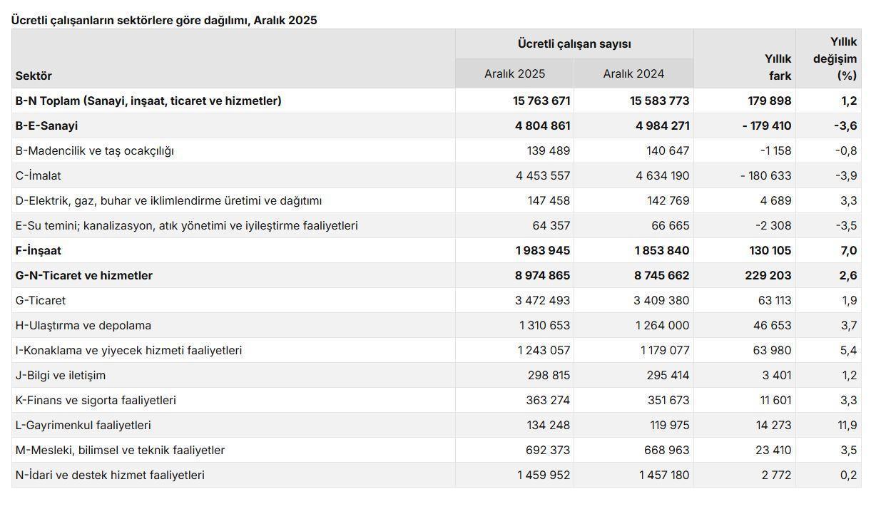 TÜİK, Aralık 2025 dönemine ilişkin ücretli çalışan istatistiklerini açıkladı. Buna göre; sanayi, inşaat ve ticaret-hizmet sektörleri toplamında ücretli çalışan sayısı bir önceki yılın aynı ayına göre yüzde 1,2 arttı. Ücretli çalışan sayısı bir önceki yılın aynı ayında 15 milyon 583 bin 773 kişi iken, 2025 yılı Aralık ayında 15 milyon 763 bin 671 kişi oldu. Ücretli çalışanların alt detaylarına bakıldığında; 2025 Aralık ayında ücretli çalışan sayısı yıllık olarak sanayi sektöründe yüzde 3,6 azaldı, inşaat sektöründe yüzde 7 arttı ve ticaret-hizmet sektöründe yüzde 2,6 arttı.
