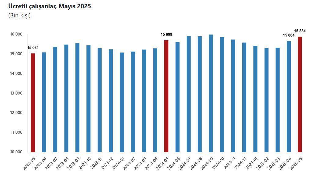 TÜİK, Mayıs 2025 dönemine ilişkin ücretli çalışan istatistiklerini açıkladı. Buna göre; sanayi, inşaat ve ticaret-hizmet sektörleri toplamında ücretli çalışan sayısı bir önceki yılın aynı ayına göre yüzde 1,2 arttı. Ücretli çalışan sayısı bir önceki yılın aynı ayında 15 milyon 698 bin 674 kişi iken, 2025 yılı Mayıs ayında 15 milyon 883 bin 683 kişi oldu. Ücretli çalışanların alt detaylarına bakıldığında; 2025 Mayıs ayında ücretli çalışan sayısı yıllık olarak sanayi sektöründe yüzde 3,1 azaldı, inşaat sektöründe yüzde 4,6 arttı ve ticaret-hizmet sektöründe yüzde 2,9 arttı.