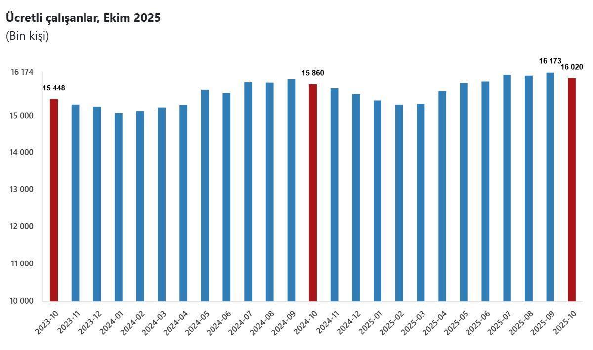 TÜİK, Ekim 2025 dönemine ilişkin ücretli çalışan istatistiklerini açıkladı. Buna göre, sanayi, inşaat ve ticaret-hizmet sektörleri toplamında ücretli çalışan sayısı 2025 Ekim ayında bir önceki yılın aynı ayına göre yüzde 1 arttı. Ücretli çalışan sayısı bir önceki yılın aynı ayında 15 milyon 860 bin 31 kişi iken, 2025 yılı ekim ayında 16 milyon 20 bin 394 kişi oldu. Ücretli çalışanların alt detaylarına bakıldığında, 2025 Ekim ayında ücretli çalışan sayısı yıllık olarak sanayi sektöründe yüzde 3,5 azaldı, inşaat sektöründe yüzde 6,2 arttı ve ticaret-hizmet sektöründe yüzde 2,5 arttı.