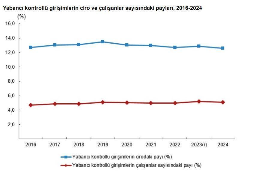 TÜİK, 2024 yılına ilişkin yabancı kontrollü girişim istatistiklerini açıkladı. Buna göre; yabancı kontrolündeki girişim sayısı 2023 yılında 10 bin 673 iken 2024 yılında 11 bin 86 oldu. Bu girişimlerin toplam cirodaki payı 2023 yılında yüzde 12,9 olurken, 2024'te ise yüzde 12,6 olarak gerçekleşti.