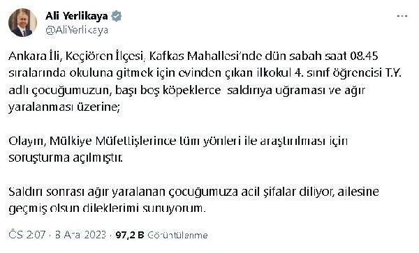 ANKARA, (DHA)- İÇİŞLERİ Bakanı Ali Yerlikaya, Ankara'da ilkokul öğrencisi Tunahan Yılmaz'ın (10) sokak köpeklerinin saldırısı sonucu ağır yaralandığı olayın tüm yönleriyle araştırılması için soruşturma açıldığını duyurdu.