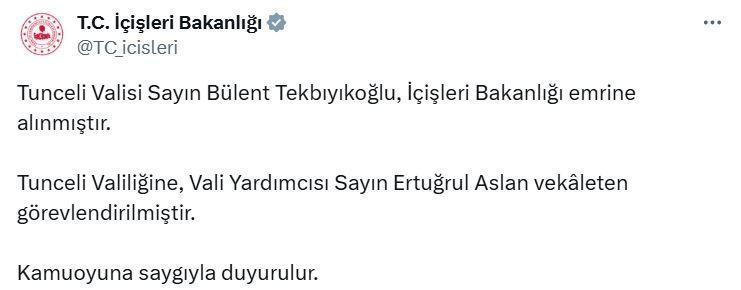 Bakanlıktan yapılan yazılı açıklamada, "Tunceli Valisi Sayın Bülent Tekbıyıkoğlu, İçişleri Bakanlığı emrine alınmıştır. Tunceli Valiliğine, Vali Yardımcısı Sayın Ertuğrul Aslan vekaleten görevlendirilmiştir" denildi. (DHA)