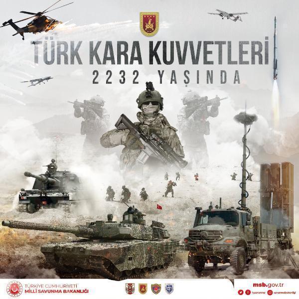 Bakanlığın Twitter hesabından yapılan açıklamada, "Şan ve şerefle dolu tarihimizin canlı şahidi olan ve 2 bin 232 yıldır milletimizin sarsılmaz gücü olarak görev yapan Türk Kara Kuvvetleri'mizin 2 bin 232'nci kuruluş yıl dönümü kutlu olsun. Metehan'dan Atatürk'e kadar kahraman komutanlar yetiştirerek nice zaferler elde eden bu büyük ordunun her bir neferini selamlıyor, şehitlerimizi ve ebediyete irtihal etmiş gazilerimizi rahmet ve saygıyla anıyoruz" denildi.