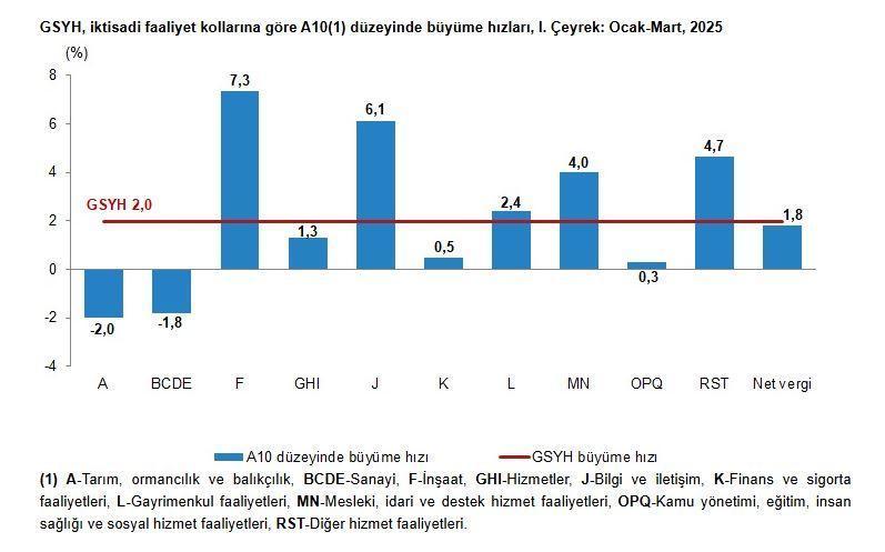 TÜİK, bu yılın birinci çeyreğine ilişkin dönemsel GSYH verilerini açıkladı. Buna göre; GSYH 2025 yılı birinci çeyrek ilk tahmini zincirlenmiş hacim endeksi olarak, bir önceki yılın aynı çeyreğine göre yüzde 2 arttı. GSYH'yi oluşturan faaliyetler incelendiğinde; inşaat sektörü toplam katma değeri yüzde 7,3, bilgi ve iletişim faaliyetleri yüzde 6,1, diğer hizmet faaliyetleri yüzde 4,7, mesleki, idari ve destek hizmet faaliyetleri yüzde 4, gayrimenkul faaliyetleri yüzde 2,4, ürün üzerindeki vergiler eksi sübvansiyonlar yüzde 1,8, hizmetler yüzde 1,3, finans ve sigorta faaliyetleri yüzde 0,5 ve kamu yönetimi, eğitim, insan sağlığı ve sosyal hizmet faaliyetleri yüzde 0,3 arttı. Tarım sektörü yüzde 2, sanayi ise yüzde 1,8 azaldı. Üretim yöntemiyle GSYH tahmini, 2025 yılının birinci çeyreğinde cari fiyatlarla bir önceki yılın aynı çeyreğine göre yüzde 36,7 artarak 12 trilyon 125 milyar 173 milyon TL oldu. GSYH'nin birinci çeyrek değeri cari fiyatlarla ABD doları bazında 335 milyar 504 milyon olarak gerçekleşti.