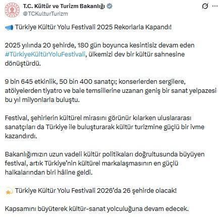 Festivalin oluşturduğu kültürel hareketlilik, kent ekonomilerine ciddi bir ivme kazandırırken şehirlerin turizm potansiyelini güçlendiren önemli bir çarpan etkisi oluşturdu. Festival, gelecek yıl çok daha geniş bir coğrafyada devam edecek. Bakanlık, 2026'da festivalin 26 şehre ulaşacağını duyurarak hem kapsamı hem de sanat çeşitliliğini daha da büyütecek yeni bir dönemin işaretini verdi. (DHA)