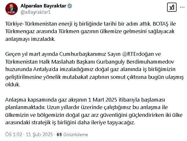 ANKARA, (DHA)- ENERJİ ve Tabii Kaynaklar Bakanı Alparslan Bayraktar, "Türkiye-Türkmenistan enerji iş birliğinde tarihi bir adım attık. BOTAŞ (Boru Hatları İle Petrol Taşıma Anonim Şirketi) ile Türkmengaz arasında Türkmen gazının ülkemize gelmesini sağlayacak anlaşmayı imzaladık" dedi.