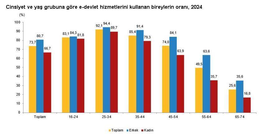 Son 12 ay içinde e-Devlet hizmetlerini kullanan bireylerin oranı yüzde 73,7 olarak gerçekleşti. Bu oran, erkeklerde yüzde 80,7, kadınlarda yüzde 66,7 oldu. e-Devlet hizmetlerini kullanan bireylerin oranı, yaş grubuna göre incelendiğinde ise bu oranın en yüksek yüzde 92,1 ile 25-34 yaş grubunda, en düşük yüzde 25,6 ile 65-74 yaş grubunda olduğu görüldü. Bireylerin e-Devlet hizmetlerini kullanım amaçları arasında, yüzde 68,6 ile resmi makamlar veya kamu hizmetleri tarafından kendisi hakkında saklanan kişisel bilgilere erişme ilk sırayı aldı. Bunu, yüzde 47,9 ile kamu kurumlarından veya kamu hizmetlerinden bir randevu alma veya rezervasyon yaptırma ve yüzde 45,1 ile kamu kuruluşlarına ait internet sitelerinden bilgi edinme takip etti.