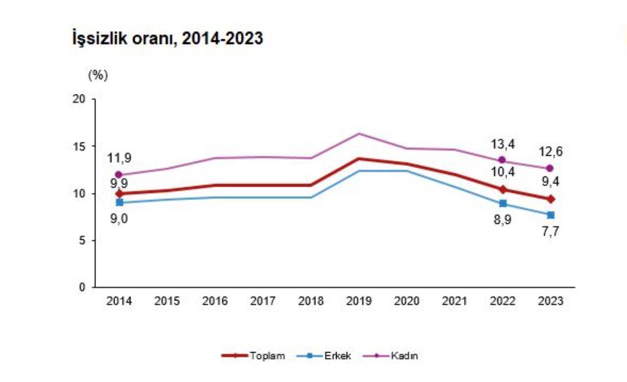 Türkiye İstatistik Kurumu, 'İş Gücü İstatistikleri 2023' verilerini açıkladı. Buna göre, ülke genelinde işsiz sayısı 2023 yılında bir önceki yıla göre 318 bin kişi azalarak 3 milyon 264 bin kişi oldu. İşsizlik oranı ise 1 puan azalarak yüzde 9,4 seviyesinde gerçekleşti. Böylece 2014'ten bu yana yüzde 9,9'un üzerinde seyreden işsizlik oranı, son 10 yılın en düşük seviyesini gördü. İşsizlik oranı erkeklerde yüzde 7,7 iken; kadınlarda yüzde 12,6 olarak tahmin edildi.