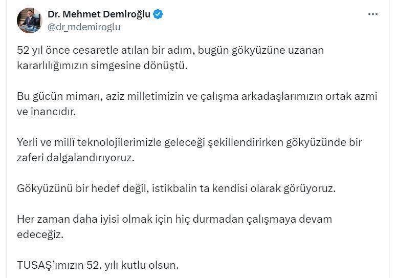 TUSAŞ Genel Müdürü Mehmet Demiroğlu da sosyal medya hesabından yaptığı açıklamada, "52 yıl önce cesaretle atılan bir adım, bugün gökyüzüne uzanan kararlılığımızın simgesine dönüştü. Bu gücün mimarı, aziz milletimizin ve çalışma arkadaşlarımızın ortak azmi ve inancıdır. Yerli ve milli teknolojilerimizle geleceği şekillendirirken gökyüzünde bir zaferi dalgalandırıyoruz. Gökyüzünü bir hedef değil, istikbalin ta kendisi olarak görüyoruz. Her zaman daha iyisi olmak için hiç durmadan çalışmaya devam edeceğiz. TUSAŞ'ımızın 52'nci yılı kutlu olsun" dedi. (DHA)