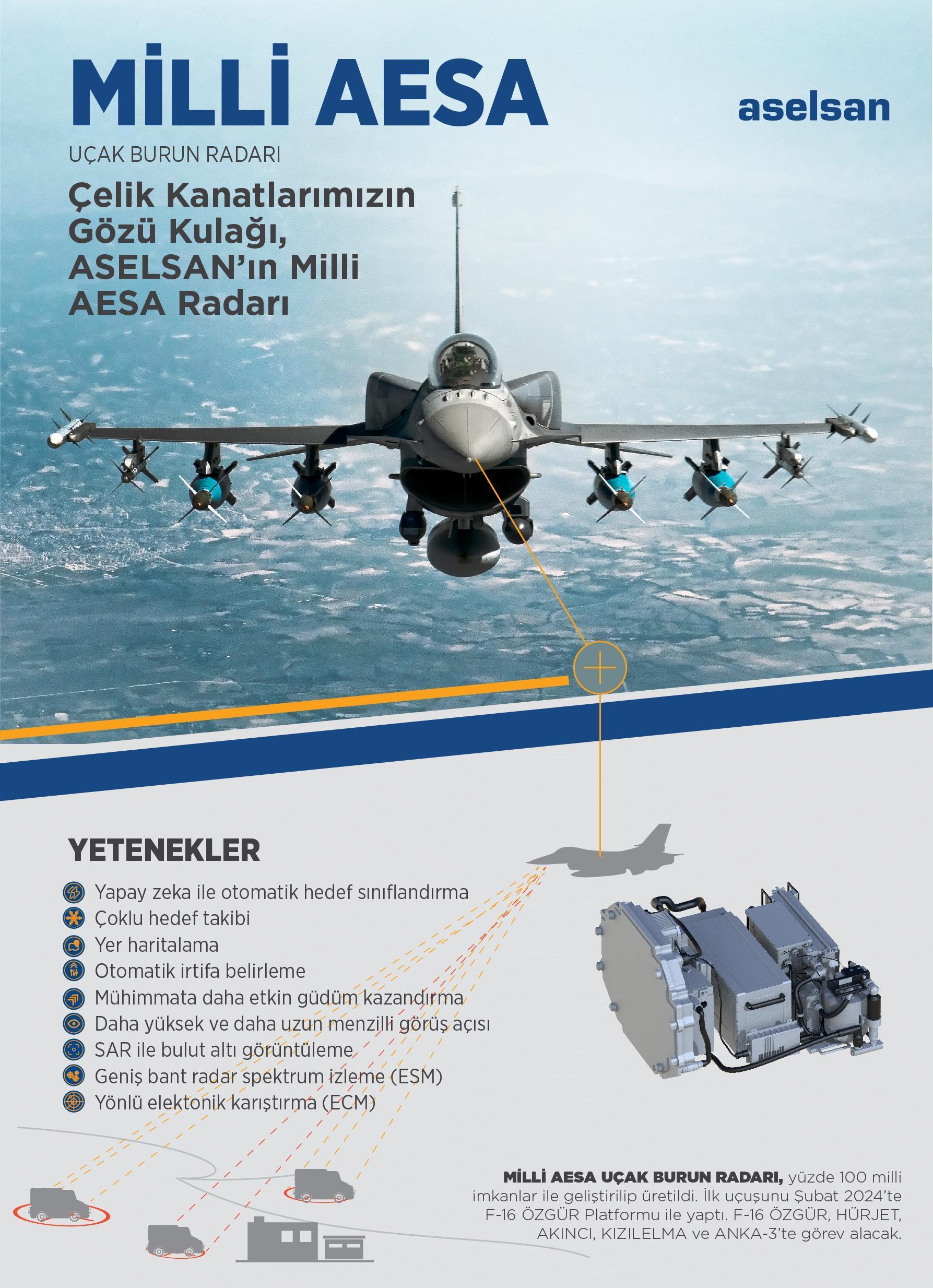 Muharip uçaklar ve İHA’lar için geliştirilen ASELSAN Milli AESA Uçak Burun Radarının ilk uçuşu 15 Şubat 2024’te görev bilgisayarı da millileştirilen F-16 ÖZGÜR Platformu ile gerçekleştirildi. Milli AESA Uçak Burun Radarı, çok yakın zamanda AKINCI ile de uçuşlarına başlayacak. 2024 yılı içinde başka jet uçakları ile diğer milli İHA’lara entegrasyonların yapılmasının ardından uçuşlar gerçekleştirilecek. Gök Vatan’daki çelik kanatların olmazsa olmaz parçası niteliğindeki AESA Uçak Burun Radarının otomatik tanıma, çoklu hedef takibi, yer haritalama, mesafe ölçümü, otomatik irtifa belirleme, SAR ile bulut altı gözetleme, yapay zekâ destekli algoritmalar ile otomatik hedef sınırlama, geniş bantta radar spektrumu izleme (ESM), yönlü elektronik karıştırma (ECM) ve mühimmata daha etkin güdüm kazandırma kabiliyetleri bulunuyor.