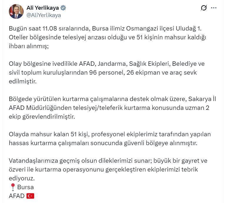 İçişleri Bakanı Ali Yerlikaya, sanal medya hesabından olaya ilişkin açıklama yaptı. Bakan Yerlikaya, açıklamasında, "Bugün saat 11.08 sıralarında, Bursa ilimiz Osmangazi ilçesi Uludağ 1'inci Oteller Bölgesi'nde telesiyej arızası olduğu ve 51 kişinin mahsur kaldığı ihbarı alınmış; olay bölgesine ivedilikle AFAD, jandarma, sağlık ekipleri, belediye ve sivil toplum kuruluşlarından 96 personel, 26 ekipman ve araç sevk edilmiştir. Bölgede yürütülen kurtarma çalışmalarına destek olmak üzere, Sakarya İl AFAD Müdürlüğü'nden telesiyej/teleferik kurtarma konusunda uzman 2 ekip görevlendirilmiştir. Olayda mahsur kalan 51 kişi, profesyonel ekiplerimiz tarafından yapılan hassas kurtarma çalışmaları sonucunda güvenli bölgeye alınmıştır. Vatandaşlarımıza geçmiş olsun dileklerimizi sunar; büyük bir gayret ve özveri ile kurtarma operasyonunu gerçekleştiren ekiplerimizi tebrik ediyoruz" dedi. (DHA)