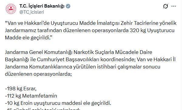 Bakanlığın sanal medya hesabından yapılan açıklamaya göre; Jandarma Genel Komutanlığı Narkotik Suçlarla Mücadele Daire Başkanlığı ile Cumhuriyet başsavcılıkları koordinesinde; Van ve Hakkari il jandarma komutanlıklarınca yürütülen istihbari çalışmalar sonucu uyuşturucu madde imalatçılarına yönelik operasyon düzenlendi. Operasyonlarda; 198 kilo esrar, 112 kilo metamfetamin ve 10 kilo eroin maddesi ele geçirildi. Operasyonda 15 şüphelinin yakalandığını belirtilerek, "Uyuşturucuya yönelik operasyonlarımız ülke genelinde etkin şekilde sürdürülmektedir. Daire başkanlığımızı, kahraman jandarmamızı, Cumhuriyet başsavcılıklarımızı ve emeği geçenleri tebrik ediyoruz" denildi. (DHA)