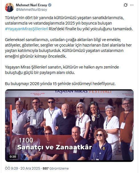 Kültür ve Turizm Bakanı Mehmet Nuri Ersoy, Yaşayan Miras Şölenleri'nin 2025 yılına ilişkin değerlendirmesini sosyal medya hesabından yaptı. Bakan Ersoy, "Türkiye'nin dört bir yanında kültürümüzü yaşatan sanatkarlarımızla, ustalarımızla ve vatandaşlarımızla 2025 yılı boyunca buluşan Yaşayan Miras Şölenleri, Rize'deki finalle bu yılki yolculuğunu tamamladı. Geleneksel sanatlarımızı, ustadan çırağa aktarılan bilgi ve emekle; atölyeler, gösteriler, sergiler ve çocuklar için hazırlanan özel alanlarla her yaştan katılımcıyla buluşturduk. Kültürümüzü yaşatan ustalarımızın emeğini görünür kılmayı önceledik. Yaşayan Miras Şölenleri; sanatın, kültürün ve halkın aynı zeminde buluştuğu güçlü bir paylaşım alanı oldu. Bu buluşmayı 2026 yılında 15 şehirde sürdürmeyi hedefliyoruz" dedi. (DHA)