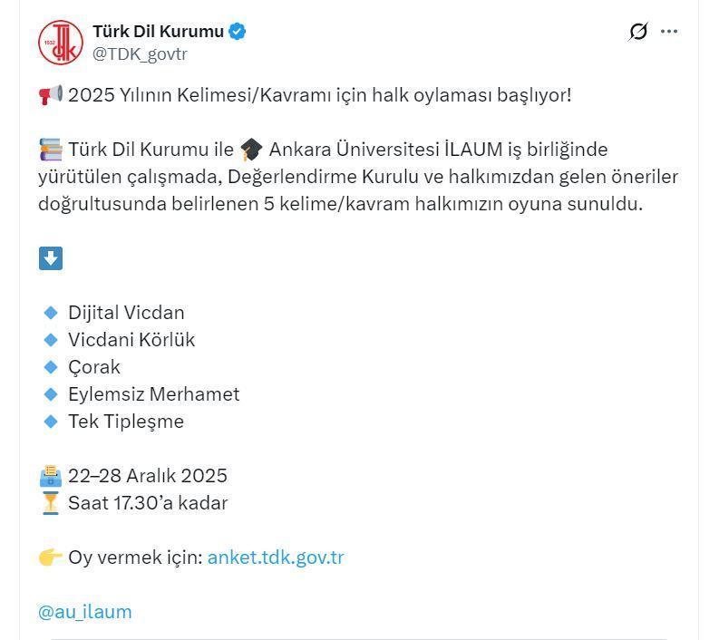 TDK'den yapılan açıklamaya göre, geçen ay Ankara Üniversitesi İletişim Araştırmaları ve Uygulama Merkezi (İLAUM) iş birliğiyle '2025 Yılının Kelimesi/Kavramı'nı belirlemek için öneri süreci başlatıldı. Bu kapsamda, Değerlendirme Kurulu ve halktan gelen önerilerin değerlendirilmesiyle belirlenen 5 kelime/kavram halkın oylamasına açıldı. Bu kelime/kavramlar 'dijital vicdan, vicdani körlük, çorak, eylemsiz merhamet ve tek tipleşme' oldu. 22 Aralık'ta başlayan oylama süreci 28 Aralık 2025'te saat 17.30'da sona erecek. Oylamaya katılmak isteyenler, Türk Dil Kurumunun genel ağ sayfasında yer alan 'https://anket.tdk.gov.tr/' bağlantı üzerinden oy kullanabilecek. (DHA)