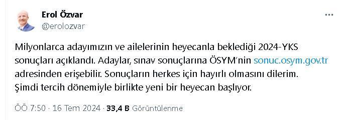 YÖK Başkanı Erol Özvar, sosyal medya hesabından yaptığı açıklamada, "Milyonlarca adayımızın ve ailelerinin heyecanla beklediği 2024-YKS sonuçları açıklandı. Adaylar, sınav sonuçlarına ÖSYM’nin https://sonuc.osym.gov.tr adresinden erişebilir. Sonuçların herkes için hayırlı olmasını dilerim" dedi. Özvar, tercih dönemiyle birlikte yeni bir heyecan başladığına dikkat çekerek, "Sevgili adaylar, tercihlerinizi yaparken ilgi alanlarınıza ve yeteneklerinize en uygun programlara yönelmenizi tavsiye ederim. Gelecek hedeflerinizi de mutlaka göz önünde bulundurun. Tercih etmeyi düşündüğünüz şehirler, üniversiteler ve programlar hakkında mümkün olduğunca fazla bilgi edinin. Tercih sürecinde, yapay zeka başta olmak üzere bu yıl ilk defa öğrenci alacak lisans ve ön lisans programlarını dikkatle incelemeniz sizler için faydalı olacaktır. Sağlıklı bir tercih dönemi geçirmeniz adına ilerleyen günlerde YÖK tarafından yapılacak bütün açıklama ve duyuruları dikkatle takip etmeniz çok önemlidir. Sınavda istediği neticeyi alamayan adaylarımız da morallerini bozmadan ileriye bakmaya devam etmelidir. Sınav her şey demek değildir, lütfen bunu unutmayın. Önünüzde parlak bir geleceğin ve başaracağınız çok şeyin olduğuna inanıyorum. Başarı için yılmadan çalışmaya devam edin" ifadelerini kullandı. (DHA)