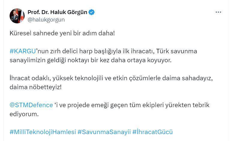 Savunma Sanayii Başkanı Haluk Görgün, konuya ilişkin sosyal medya hesabından açıklama yaptı. Görgün, "Küresel sahnede yeni bir adım daha. Kargu'nun zırh delici harp başlığıyla ilk ihracatı, Türk savunma sanayimizin geldiği noktayı bir kez daha ortaya koyuyor. İhracat odaklı, yüksek teknolojili ve etkin çözümlerle daima sahadayız, daima nöbetteyiz. STM ve projede emeği geçen tüm ekipleri yürekten tebrik ediyorum" dedi. (DHA)
