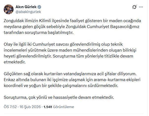 Adalet Bakanı Akın Gürlek, sanal medya üzerinden yaptığı paylaşımda, "Zonguldak ilimizin Kilimli ilçesinde faaliyet gösteren bir maden ocağında meydana gelen göçük sebebiyle Zonguldak Cumhuriyet Başsavcılığımız tarafından soruşturma başlatılmıştır. Olay ile ilgili iki Cumhuriyet savcısı görevlendirilmiş olup teknik incelemeleri yürütmek üzere maden mühendislerinden oluşan bilirkişi heyeti görevlendirilmiştir. Soruşturma tüm yönleriyle titizlikle devam etmektedir. Göçükten sağ olarak kurtarılan vatandaşlarımıza acil şifalar diliyorum. Enkaz altında bulunan iki işçimize ulaşmak için arama-kurtarma ekipleri koordineli ve yoğun bir şekilde çalışmalarını sürdürmektedir. Soruşturma, çok yönlü ve hassasiyetle devam etmektedir" ifadelerine yer verdi. (DHA)