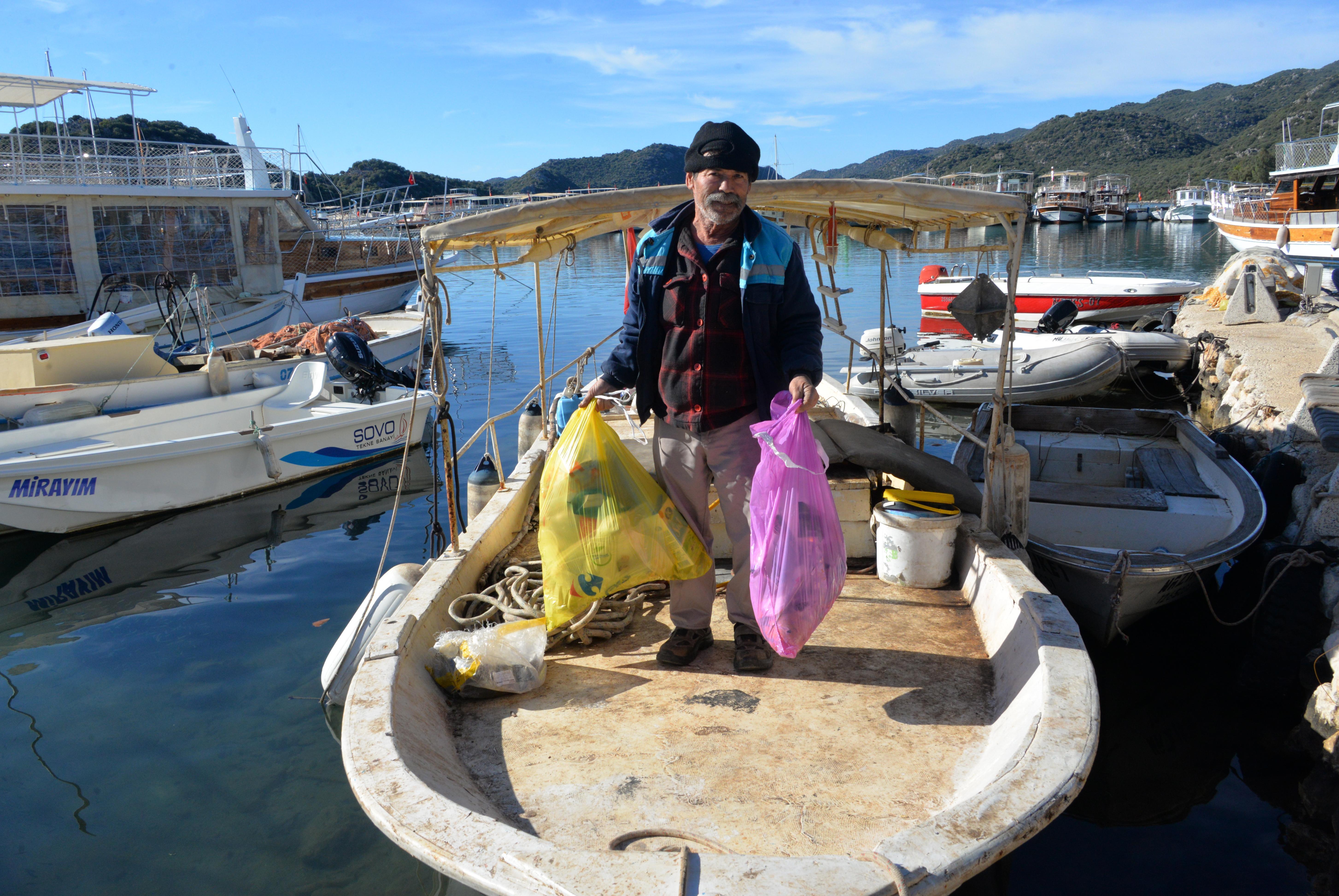 Mehmet ÇINAR/ANTALYA, (DHA)- ANTALYA'nın doğa harikası Kekova yarımadasında yaşayan Cevdet Eren (62), 30 yıldır Kaleköy, Akvaryum, Hamidiye, Tersane gibi doğa harikası koylara tur tekneleri ve özel yatlarıyla gelenlerin bıraktığı çöpleri topluyor. Pancar motorlu küçük teknesiyle saat 04.00'te temizliğe başlayan Eren'in yazın topladığı çöpün miktarı, günde 3 tona kadar çıkıyor.