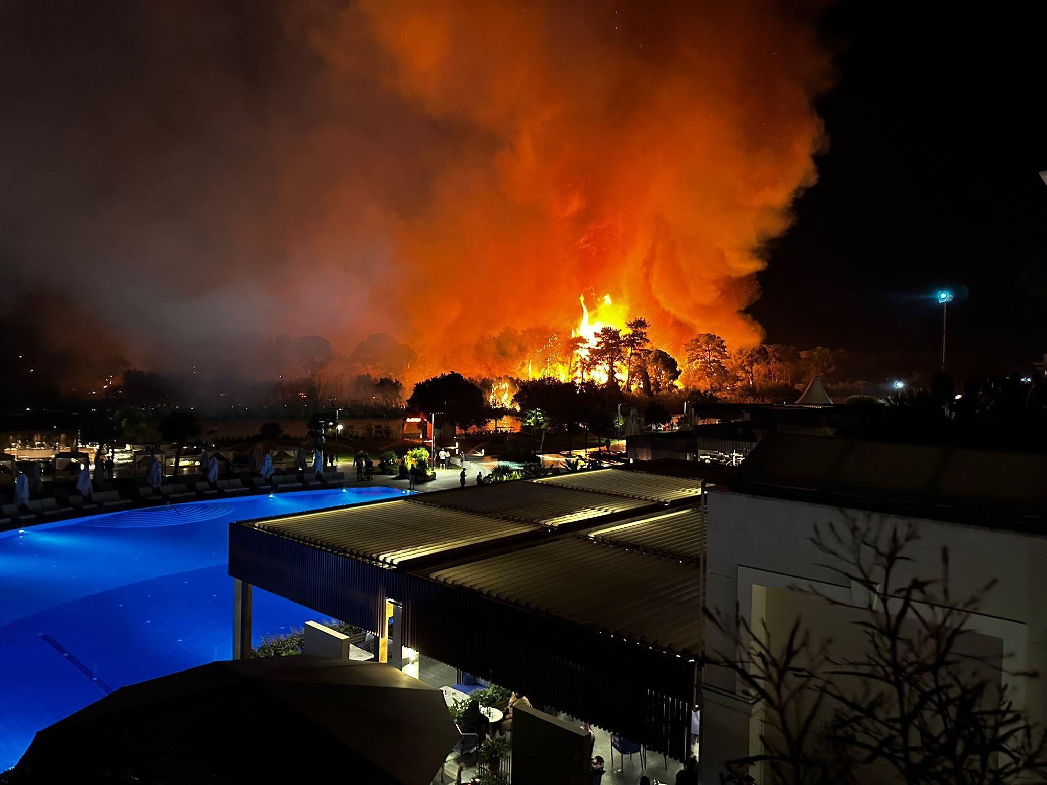 Antalya'nın Aksu ilçesinde çıkan orman yangını sonrası iki değil bir otelin tahliye edildiği belirtilirken, tedbir amaçlı tahliye edilen 5 yıldızlı otelde konaklayanlar, aynı gruba ait başka bir otele yerleştirildi. Ekiplerin alevlere müdahalesi devam ediyor. (DHA)