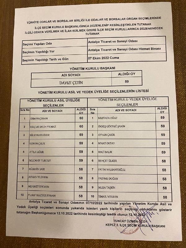 Kepez 3'üncü İlçe Seçim Kurulu Başkanı Tuncay Özmen imzasıyla gönderilen tutanakta, “ATSO'nun 7 Ekim 2022 tarihinde yapılan yönetim kurulu asil ve yedek üyeliği seçimleri sonunda isimleri yazılı kişilerin seçilmiş olduklarını gösterir tutanağın Başkanlığımızca 12 Ekim 2022 tarihinde kesinleştiği tasdik olunur" denildi.