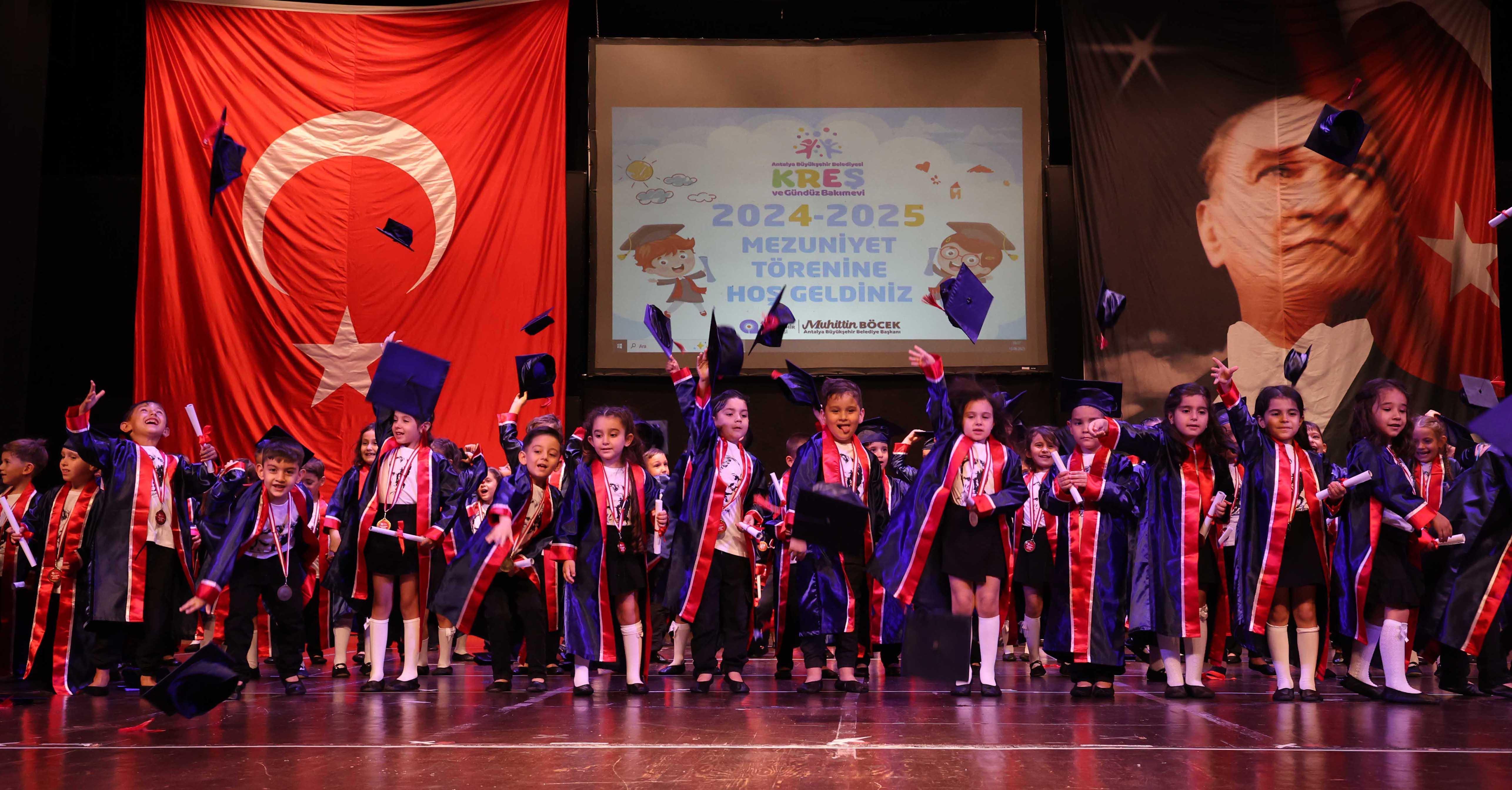 Büyükşehir Belediyesi'nin Antalya merkezinde yer alan Güzeloba, Yenigün, Kanal, Sedir, Cam Piramit Kreş ve Gündüz Bakımevi'nde eğitim gören 280 çocuk, Atatürk Kültür Merkezi Aspendos Salonu'nda düzenlenen törenle 2024-2025 yılı mezuniyet belgelerini aldı. Törene; Antalya Büyükşehir Belediyesi Sosyal Hizmetler Dairesi Başkanlığı Çocuk ve Gençlik Hizmetleri Şube Müdürü Ahmet Oğuz Dağlı, öğretmenler ve öğrenci ailelerinin katılımlarıyla gerçekleşti. Başarılı bir eğitim dönemini geride bırakan öğrenciler, eğitimleri boyunca edindikleri bilgi ve becerilerini sahneleyerek unutulmaz bir final yaptı.