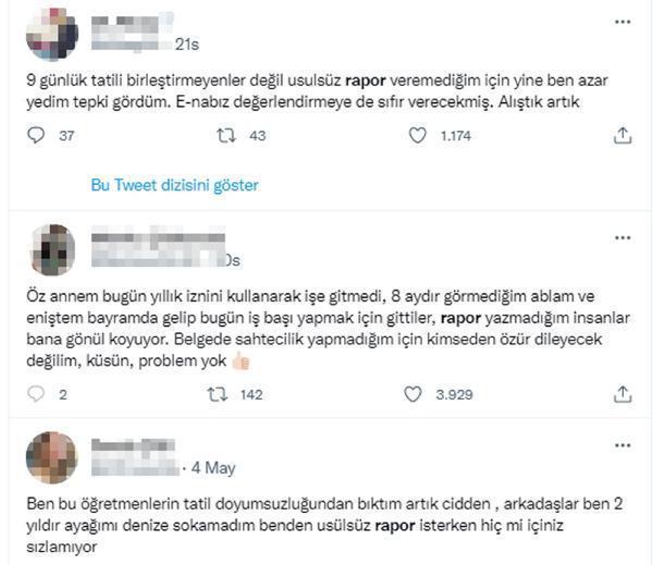 Ramazan Bayramı, bu yıl 1- 4 Mayıs tarihleri arasında kutlandı. 30 Nisan Cumartesi günüyle birlikte 5 günlük tatil imkanı sunan bayram tatilini, rapor alarak 5- 6 Mayıs Perşembe ve Cuma günlerini de dahil edip, 9 güne çıkartmak isteyen birçok devlet memuru veya özel sektör çalışanı, sağlık ocakları ve hastanelerin acil servislerine gitti. Hasta olmadıkları halde tatili 9 güne çıkartmak için rapor talep edenlere doktorlar tepki gösterdi. Birçok doktor, bu şekilde kendilerinden rapor talep edilmesini sosyal medyadan paylaşırken, aynı zamanda çalıştıkları hastanelerin başhekimleri ve üst makamlarına da durumu bildirdi.