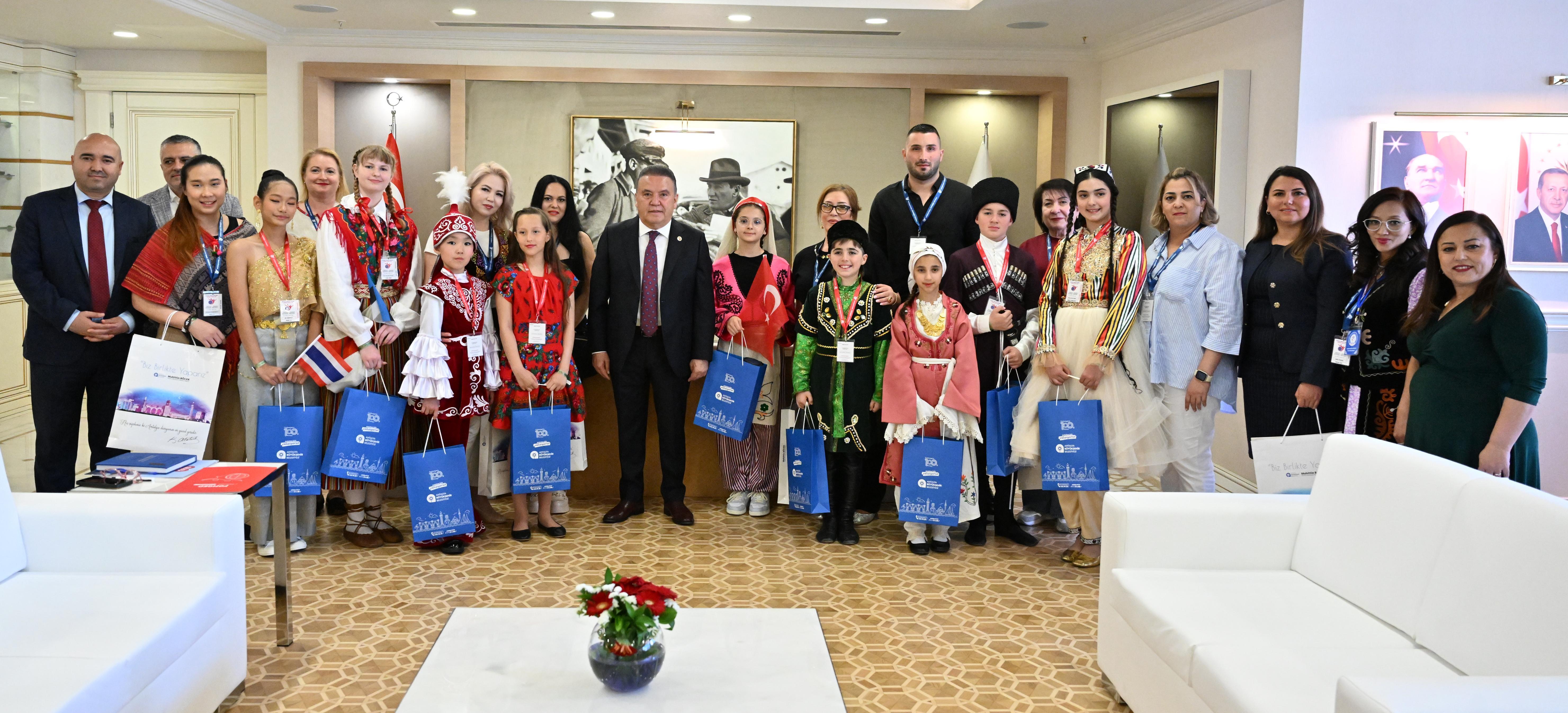 Başkan Muhittin Böcek, “Bu özel günde, dünya çocuklarının barış ve kardeşlik içinde bir araya gelmesi, bizler için büyük bir gurur kaynağıdır. 23 Nisan Ulusal Egemenlik ve Çocuk Bayramı, dünyada çocuklara armağan edilen tek bayramdır ve bu bayramı bizlere Atamız armağan etmiştir. Tüm dünya çocuklarının 23 Nisan Ulusal Egemenlik ve Çocuk Bayramı kutlu olsun" dedi. Başkan Böcek, konuk ülke çocuklarıyla sohbet ederek, çeşitli hediyeler verdi. 10 farklı ülkeden festival kapsamında Antalya'ya gelen çocuklar da Başkan Muhittin Böcek'e yörelerine ait hediyeleri takdim etti. Başkan Muhittin Böcek, konuk ülke çocuklarıyla ziyaret anısına fotoğraf çektirdi.