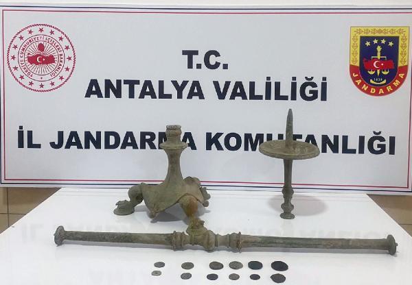 Demre ilçesi Gökyazı Mahallesi'nde Y.T.'nin kargoyla tarihi eser niteliğindeki malzemeleri göndereceği bilgisini alan Kaş İlçe Jandarma Komutanlığı ekipleri, Demre Cumhuriyet Başsavcılığı koordinesinde operasyon düzenledi. Operasyonda 12 adet sikke ve üç parçadan oluşan şamdan ele geçirildi.