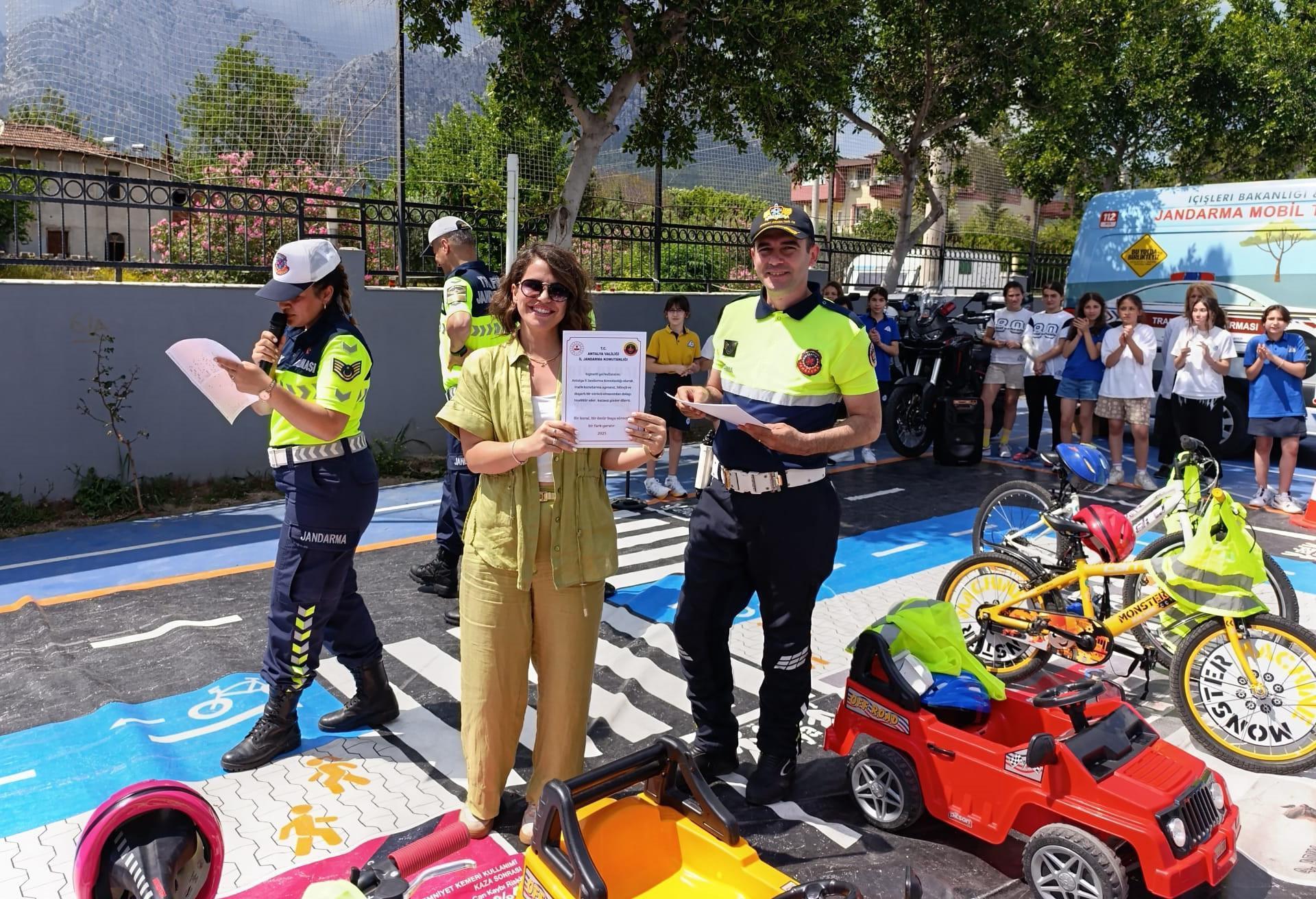 Kemer'e bağlı Göynük Mahallesi'ndeki bir okulda trafik jandarması ekipleri tarafından 112 öğrenciye 'Bir Kural Bir Ömür' konulu trafik kurallarının anlatıldığı eğitim verildi. Eğitimde yaya olarak trafikte uyulması gereken kurallar, okul servis araçlarına binerken, inerken ve yolculuk esnasında uyulması gereken kurallar, emniyet kemeri kullanımı ve önemi ve bisiklet sürücülerinin uyması gereken kurallar hakkında eğitimler özel kurulan alanda uygulamalı olarak verildi. 5 yıl içerisinde herhangi bir cezai işlem yapılamayan öğretmenlere de program kapsamında trafik kurallarına uymaları ve bilinçli sürücü olmaları dolayısıyla Antalya İl Jandarma Komutanlığı Trafik Şube Müdürlüğü ve Kemer İlçe Jandarma Komutanlığı Trafik Timlerince sertifika verildi. (DHA)