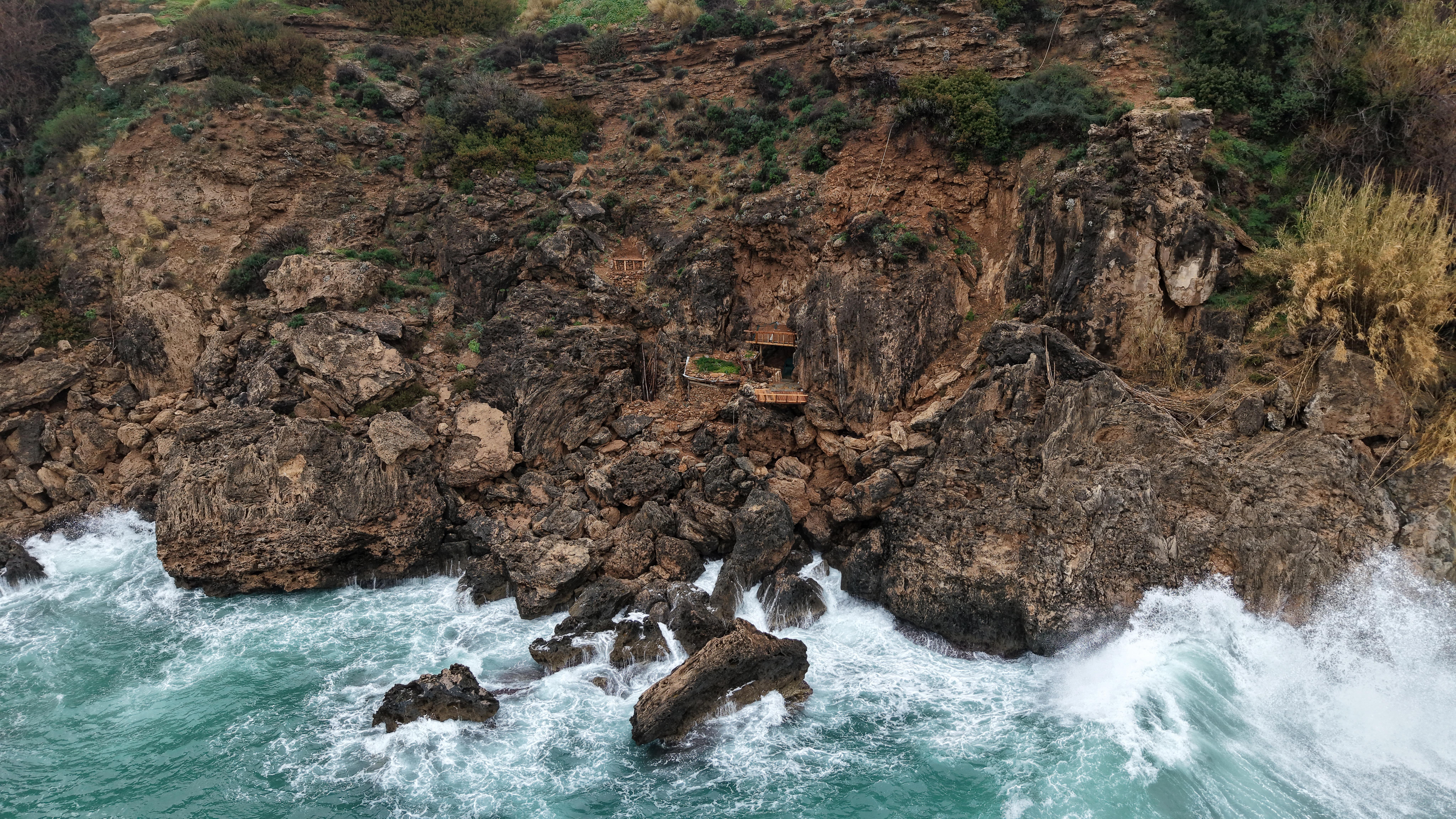 Antalya kıyılarında birçok noktada hobi amaçlı dalışlar yapan ve sanal medyada paylaşan Hüseyin Fırat, ilk olarak geçen günlerde, yüksekliği 40 metreyi bulan falezlerin bulunduğu Konyaaltı Caddesi bölgesinde yaptığı dalış sırasında, kayalıklar arasında beton fark etti. Kayalıklardan tırmanan Fırat, falezlerin üzerinde kaçak betonarme yapı ile karşılaştı. Denize kadar inen demir ve beton merdivenlerden çıkan Fırat, beton duvarlar ve demir kapı olduğunu gördü. Demir kapıdaki delikten görüntü alan Fırat, içeride kano, sandalyeler, duş ve av malzemeleri bulunan bir oda ve karayla bağlantılı olduğu düşünülen merdivenleri görüntüledi.