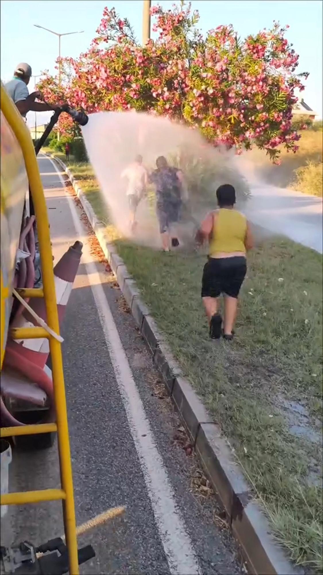 Manavgat Belediyesi Park ve Bahçeler Müdürlüğü ekipleri, kavurucu yaz sıcaklarında çocukları serinletti. Belediye ekipleri, görevli personelin kullandığı arazöz ile çocuklara su püskürttü. Hava sıcaklığının bunaltıcı hal aldığı son günlerde çocuklar belediye arazözünden püskürtülen suyla eğlendi. (DHA)