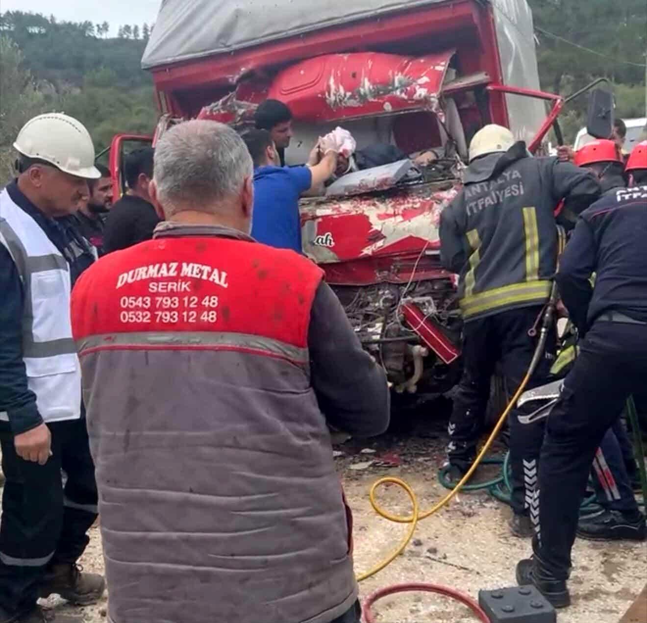 Kaza, dün saat 16.00 sıralarında Manavgat ilçesine bağlı Beşkonak yolu üzerinde meydana geldi. A.R. idaresindeki 06 FOB 124 plakalı kamyon ile arkadan gelen Mısır uyruklu M.A. yönetimindeki 70 ABT 554 plakalı muz yüklü kamyon çarpıştı. Kazayı görenlerin ihbarı üzerine olay yerine jandarma, itfaiye ve sağlık ekipleri sevk edildi. Çarpmanın etkisiyle kamyonda sıkışan sürücü Antalya Büyükşehir Belediyesi itfaiye ekiplerinin yaklaşık yarım saat süren çalışması sonucu çıkarıldı. Baş ve yüz bölgesinde ciddi yaralanmalar olduğu öğrenilen sürücü olay yerindeki ilk müdahalenin ardından Serik Devlet Hastanesi'ne götürüldü. Durumu ağır olan yaralı daha sonra Antalya Şehir Hastanesi'ne sevk edildi. Jandarma kazayla ilgili inceleme başlatırken, diğer kamyonun şoförü A.R.'yi ifadesi için Taşağıl Jandarma Karakolu'na götürdü. (DHA)