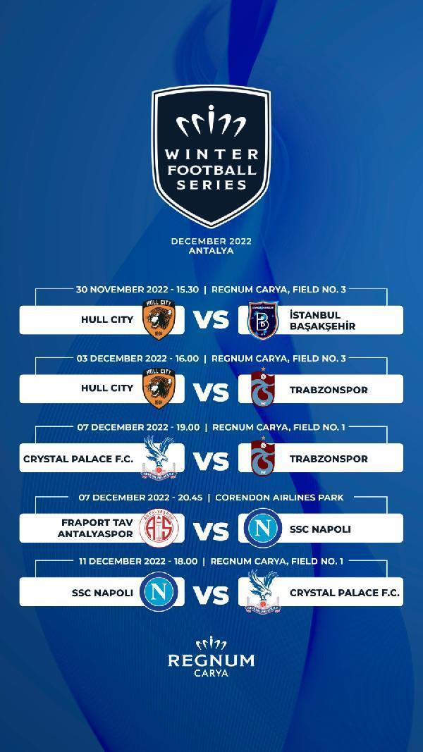 Regnum Carya tarafından organize edilen Winter Football Series'te yarın iki hazırlık maçı oynanacak. Crystal Palace ile Trabzonspor, saat 19.00'da Regnum Carya 1 No'lu sahada karşı karşıya gelecek. Günün diğer karşılaşmasında ise Fraport TAV Antalyaspor, Serie A lideri Napoli'yi saat 20.45'te Corendon Airlines Park Antalya Stadyumu'nda konuk edecek. Turnuvanın son maçında ise Napoli ile Crystal Palace mücadele edecek. 11 Aralık Pazar günü Regnum Carya 1 No'lu sahada oynanacak karşılaşma saat 18.00'de başlayacak. Napoli, bu karşılaşmanın ardından Antalya kampındaki hazırlıklarını tamamlayarak İtalya'ya dönecek.