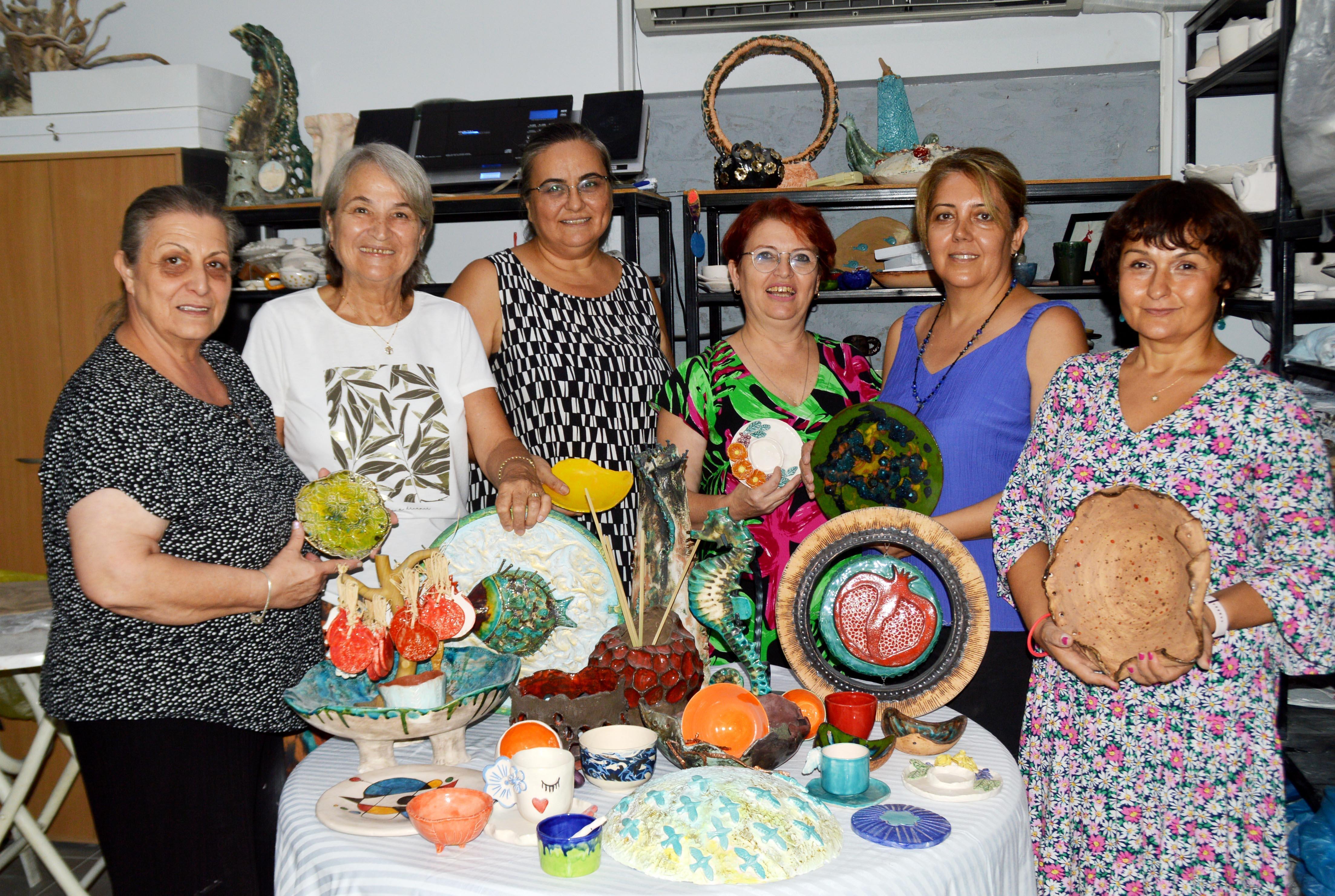 Seramik sanatçısı Candan Çelikpençe Gündüz'ün Meltem Mahallesi'ndeki seramik atölyesinde eğitim alan kursiyerler, yaz mesaisine kaldı. Denize girip serinleme, evlerinde oturma yerine sanatla uğraşmayı tercih eden sanat aşığı kadınlar bütün gün ellerinden çamuru bırakmıyor.