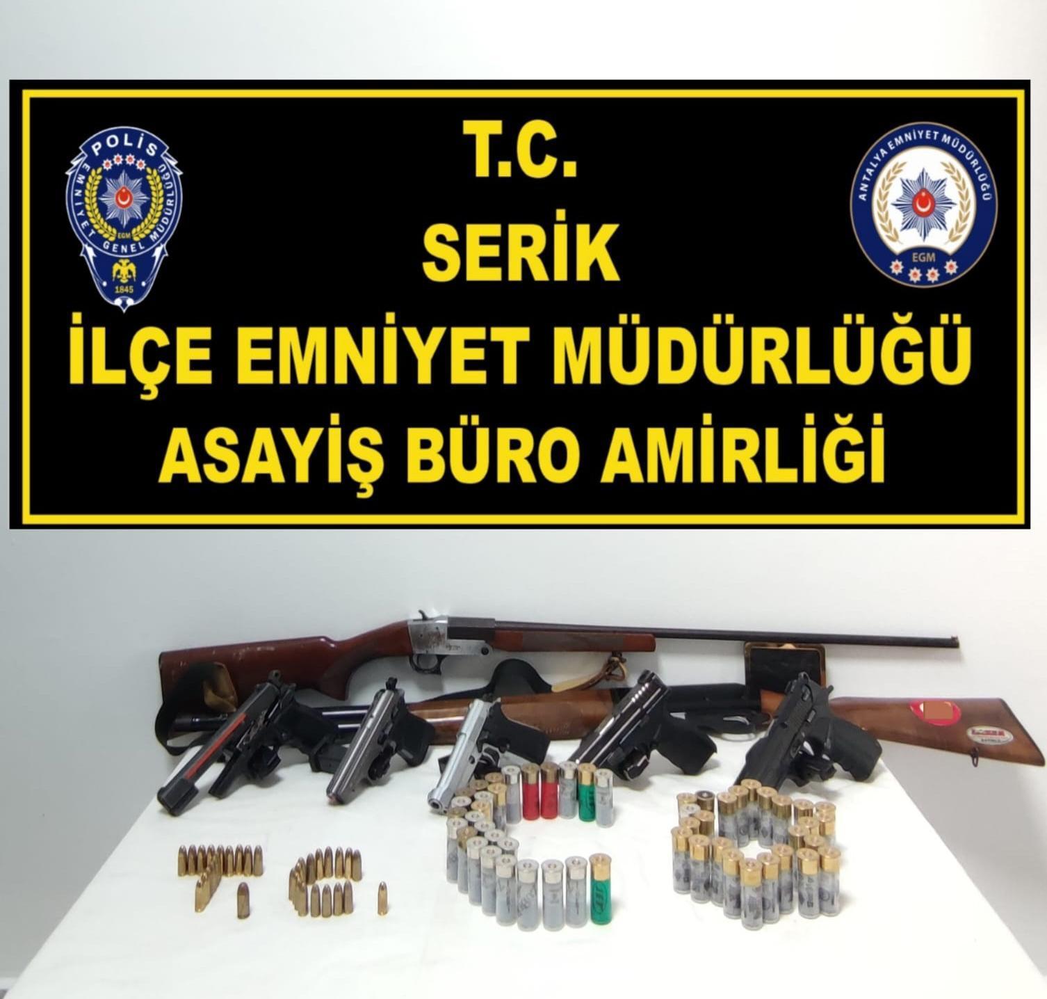 Serik'e bağlı Dikmen Mahallesi'nde 2 Ağustos günü saat 17.30 sıralarında bir akaryakıt istasyonunda gerçekleşen 'nitelikli yağma' olayıyla ilgili Serik Cumhuriyet Başsavcılığı talimatlarıyla Serik İlçe Emniyet Müdürlüğü Asayiş Büro Amirliği ekipleri çalışma başlattı. Yapılan uzun süreli kamera incelemeleri sonucu toplam 2'si maskeli 6 kişinin olayı gerçekleştirdiği tespit edildi. Olaydan bir gün sonra yapılan eş zamanlı operasyonda K.B., U.T., A.C., O.A., H.T. ve M.T. yakalanarak gözaltına alındı. Şüphelilerin evlerinde ve araçlarında yapılan aramada 5 ruhsatsız tabanca, 2 ruhsatsız av tüfeği, 32 fişek ve 53 dolu kartuş ele geçirildi. Şüpheliler emniyetteki işlemlerinin ardından sevk edildikleri adliyede tutuklandı. (DHA)