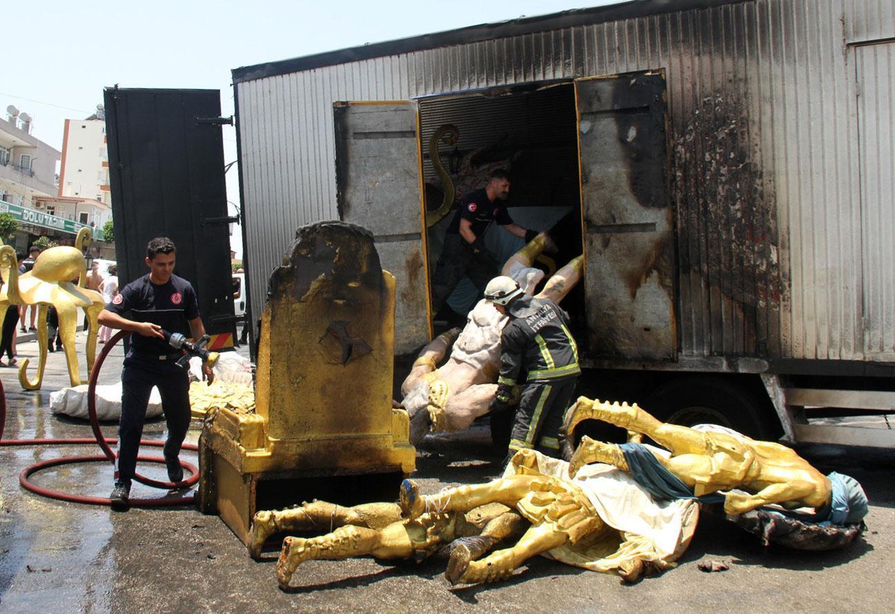 Yangında kamyonun kasa kısmı tamamen yanarken, içerisindeki animasyon dekor malzemeleri de kullanılamaz hale geldi. İtfaiye ekipleri, dekor malzemelerini kamyonun kasasından çıkartarak soğutma çalışması yaptı. Yangının çıkış nedeni teknik incelemenin ardından netlik kazanacak. (DHA)